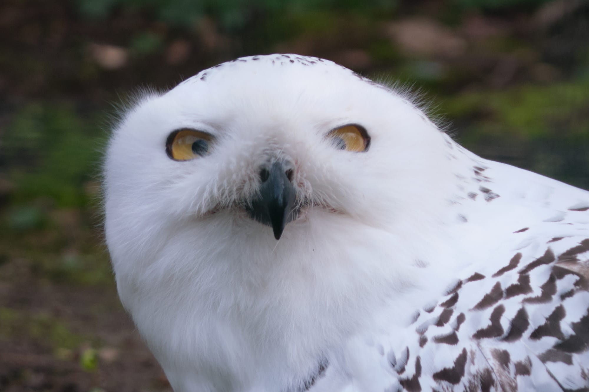 Snowy owls are some of my favorite animals. Their big eyes are beautiful, they are usually not hiding in dark corners like other, more night-adapted owls, and their white feathers make them stand out against darker backgrounds. This one just happens to look incredibly goofy because of how its nose feathers kind of block its pupils, giving the impression of severe cross-eyedness.