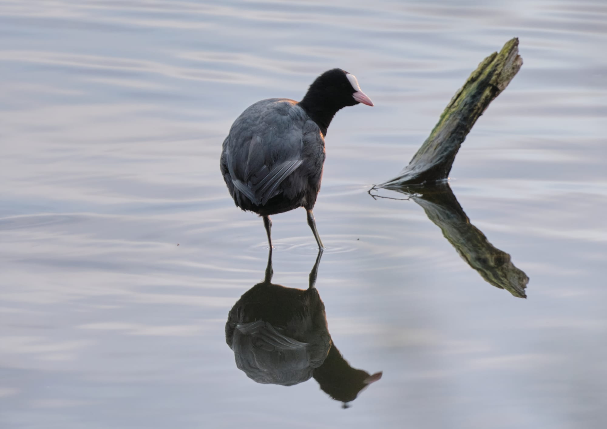 I didn't leave completely empty handed regarding portraits though. This coot was near the shore and the lake was calm. So I got it, its reflection and the same for the branch next to it.