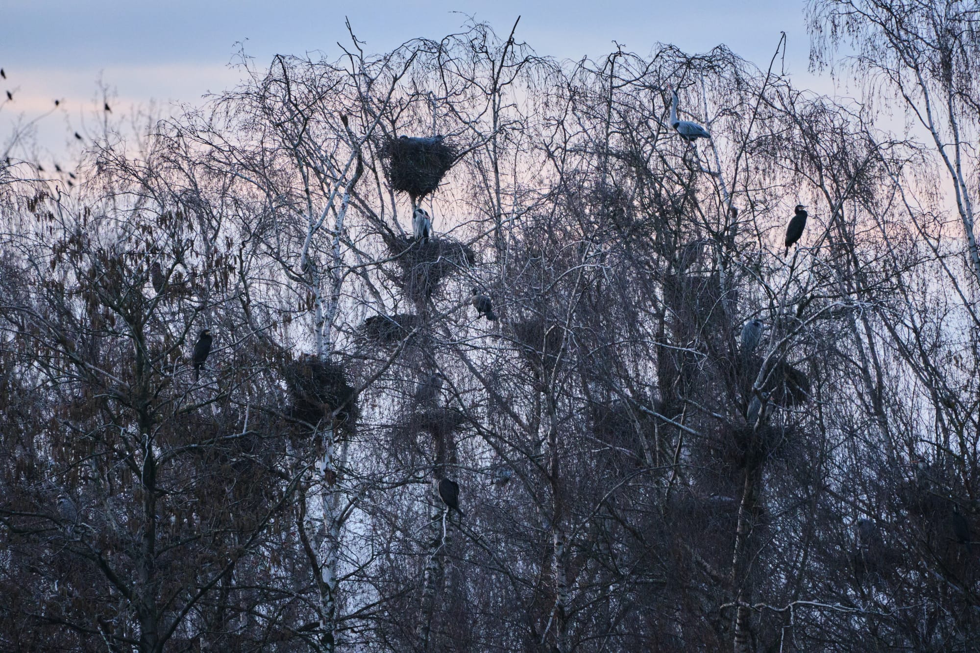 Another picture in this category sometimes called wildlife landscape. Cormorants and herons have built their nests in these trees and are just hanging out in the winter cold.