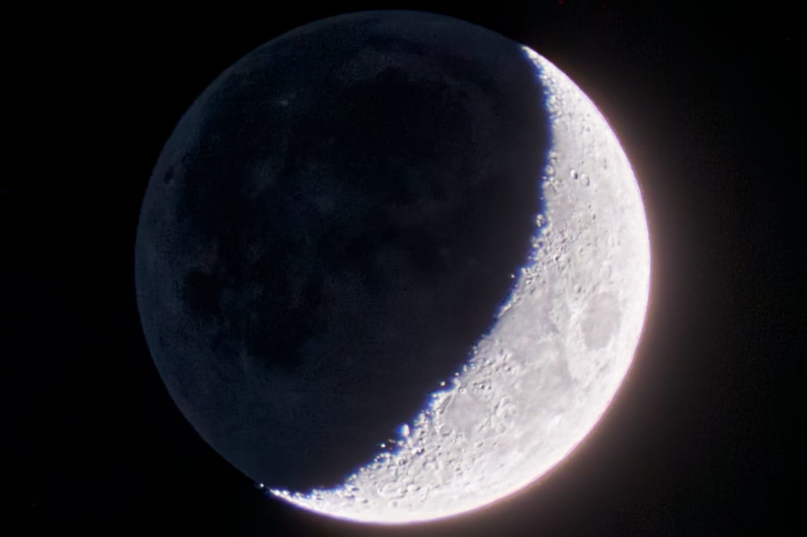 The dark side of the moon is still brighter than the space surrounding it. Light which bounced off earth is bouncing back to us from there. This light is called earthshine. It's so many times weaker than the sunlight however, that the capturing the bright and the dark side in good quality in one picture is near impossible. That's what this picture shows. But I just couldn't get the transitions right...
